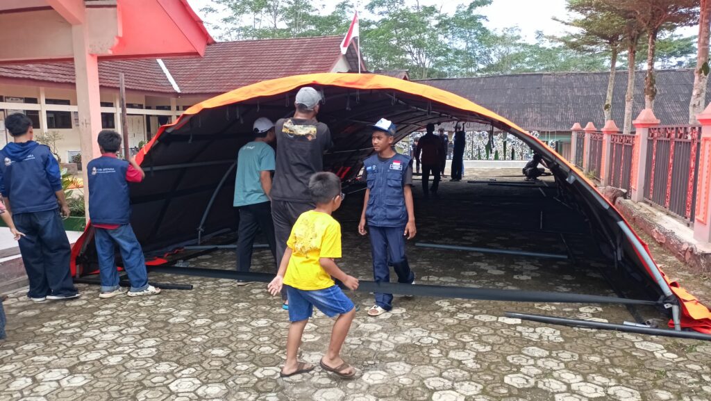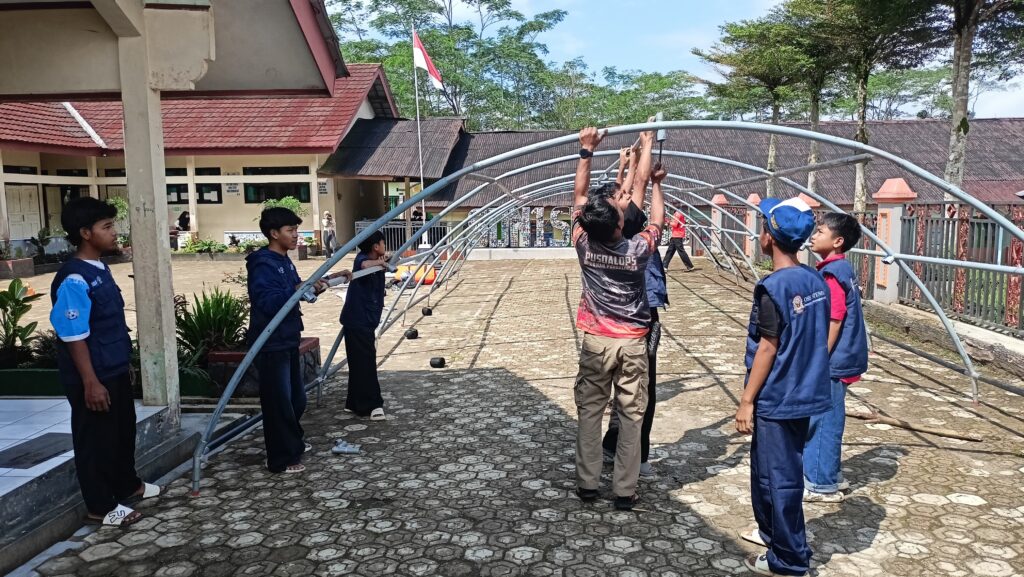 Kegiatan pemasangan tenda berjalan lancar dengan melibatkan personel dari BPBD Purbalingga serta partisipasi aktif dari siswa dan pengurus OSIS SMPN 4 Satu Atap Karangjambu.