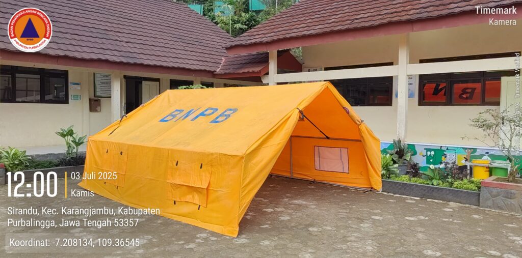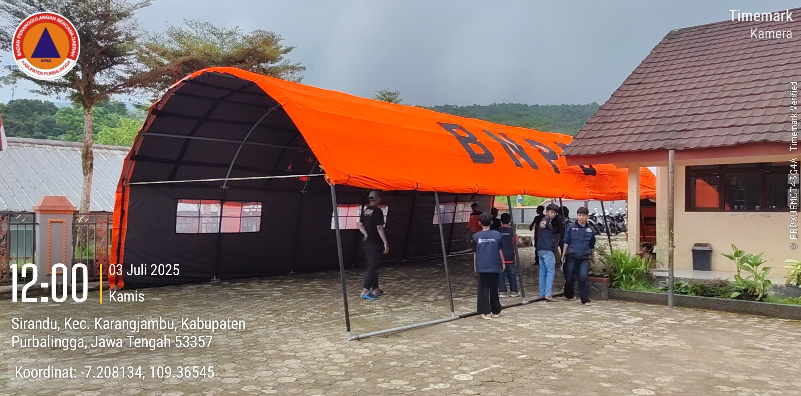 PURBALINGGA — Badan Penanggulangan Bencana Daerah (BPBD) Kabupaten Purbalingga melaksanakan kegiatan pemasangan tenda pengungsian dan tenda keluarga di halaman SMP Negeri 4 Satu Atap Karangjambu pada Kamis siang (3/7). Kegiatan berlangsung dari pukul 10.00 WIB hingga 12.00 WIB.