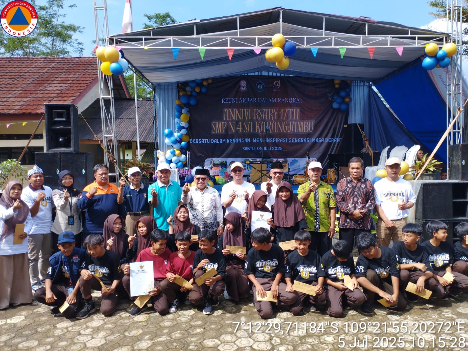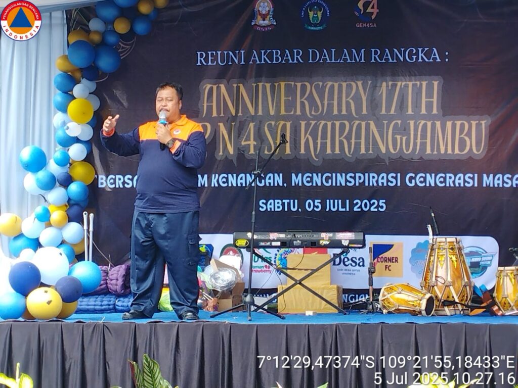 PURBALINGGA – Dalam rangka meningkatkan kesadaran dan kesiapsiagaan masyarakat terhadap bencana, Badan Penanggulangan Bencana Daerah (BPBD) Kabupaten Purbalingga melaksanakan kegiatan sosialisasi penanggulangan bencana pada acara Reuni Akbar SMP Negeri 4 Satu Atap Karangjambu, yang berlangsung pada Sabtu Pagi (5/7).