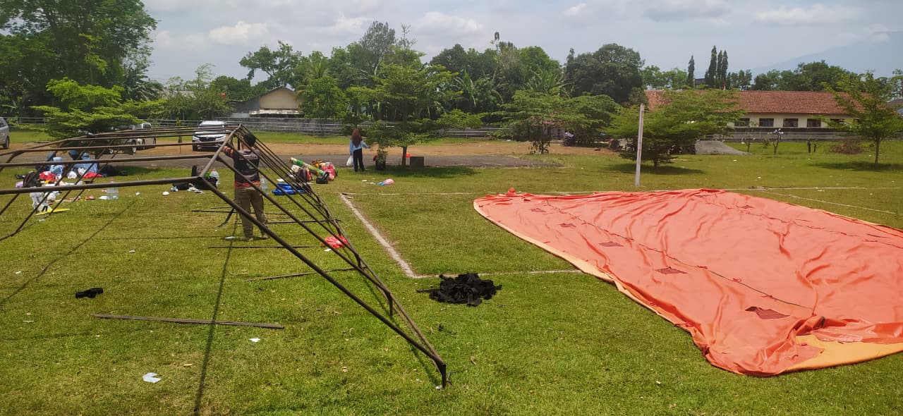 Kegiatan dimulai pukul 10.30 WIB dan berlangsung hingga 12.40 WIB dengan jumlah satu set tenda pleton lengkap yang dibongkar oleh tim BPBD. Proses pembongkaran berjalan lancar dan tertib, serta dilakukan dengan tetap memperhatikan aspek keamanan dan ketertiban peralatan.