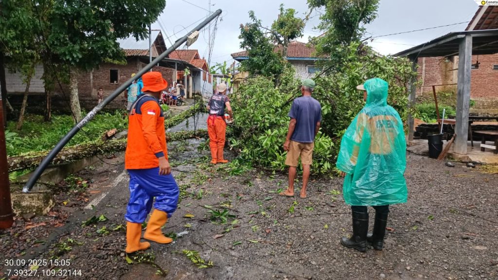 PURBALINGGA – Badan Penanggulangan Bencana Daerah Kabupaten Purbalingga melakukan giat asesmen dan penanganan dampak kejadian pohon tumbang akibat hujan lebat disertai angin kencang yang terjadi pada Selasa, 30 September 2025. Cuaca ekstrem yang terjadi sekitar pukul 13.30 WIB tersebut melanda wilayah Kecamatan Kalimanah dan Kecamatan Padamara.