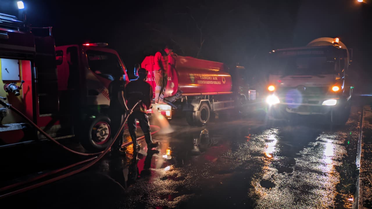 PURBALINGGA – Badan Penanggulangan Bencana Daerah Kabupaten Purbalingga membantu Pemadam Kebakaran (Damkar) dalam kegiatan penyemprotan lembayang di Jembatan Sungai Klawing Pasren, Desa Bajong, Kecamatan Bukateja, Kamis malam (27/11/2025). Langkah tersebut dilakukan menyusul kondisi jalan yang licin dan membahayakan akibat tumpukan lembayang di atas badan jalan.