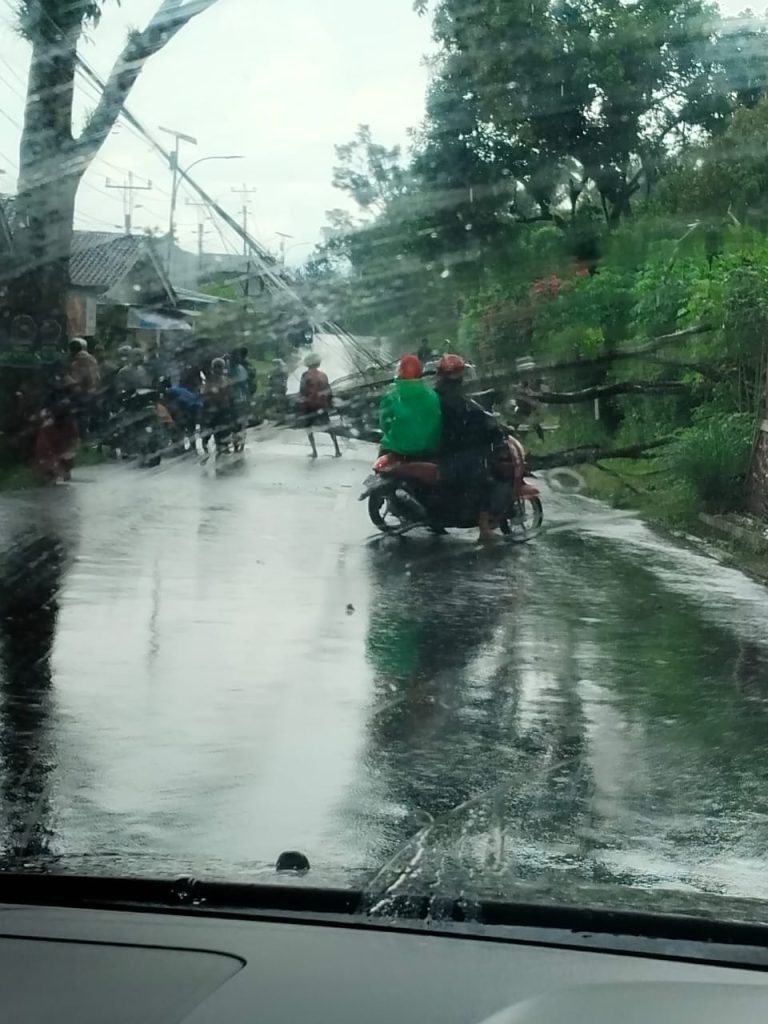 Selain menutup akses jalan, pohon tumbang juga menimpa jaringan kabel internet di sekitar lokasi kejadian.