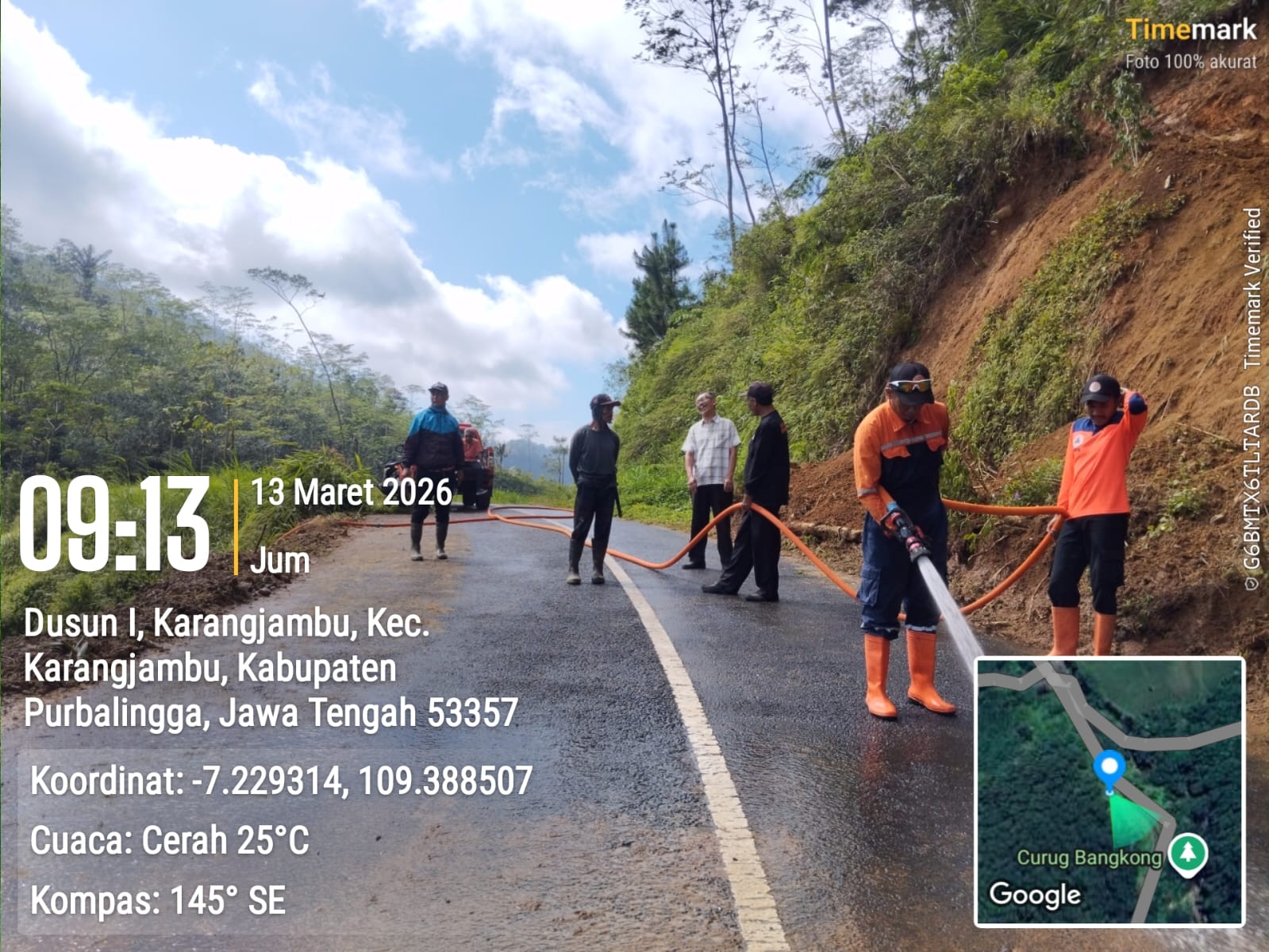 Pada Jumat, 13 Maret 2026, tim BPBD Purbalingga turun langsung ke lokasi untuk melakukan pembersihan material longsor. Penanganan dilakukan dengan bantuan mesin pompa air guna menyemprot dan membersihkan sisa material yang menutup badan jalan.