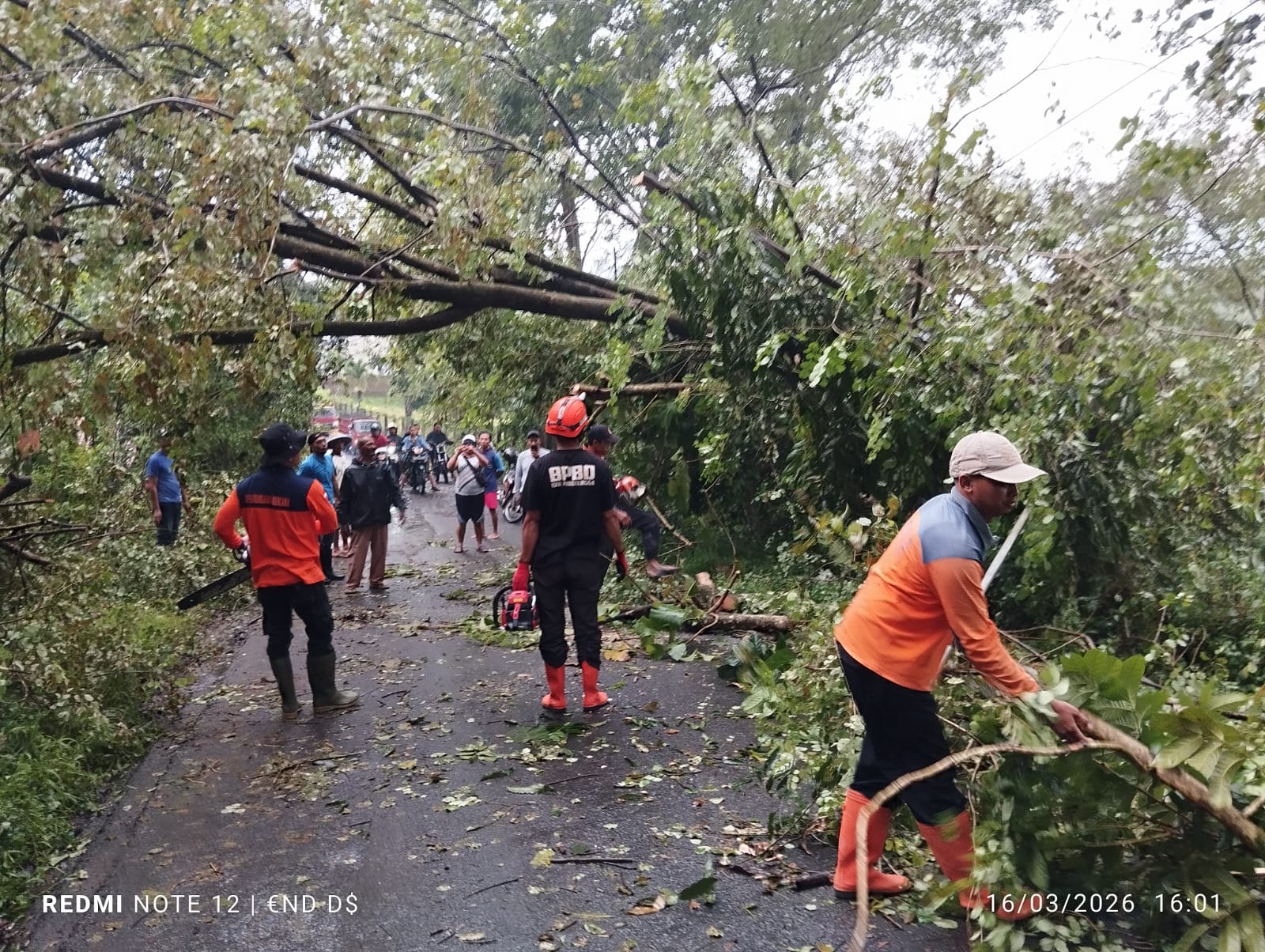 Petugas melakukan evakuasi dan pembersihan material pohon tumbang yang menutup badan jalan, sehingga akses dapat segera dipulihkan. Selain itu, penanganan juga dilakukan pada pohon yang menimpa rumah warga.